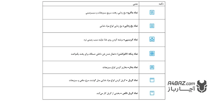 در تصویر زیر تمامی نمادهای مایکروویو سامسونگ همراه معنیهایشان مشخص شده است: